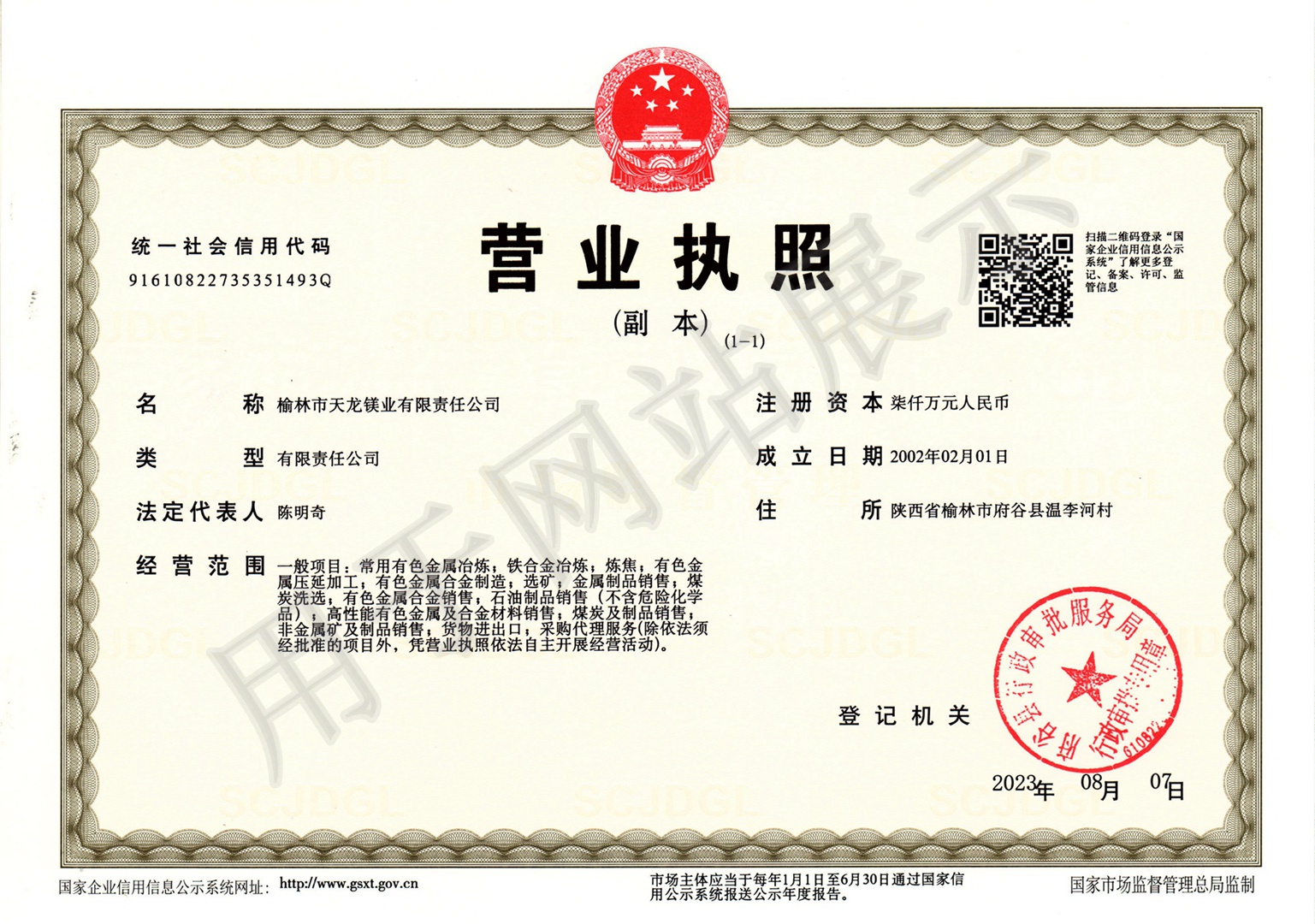 榆林市天龍鎂業(yè)有限責任公司網(wǎng)站 公司地址:陜西省府谷縣溫李河工業(yè)園區(qū) 聯(lián)系人:楊立 (貿(mào)易部經(jīng)理) 電話:+86-0912-8808019 傳真:+86-0912- 8808019